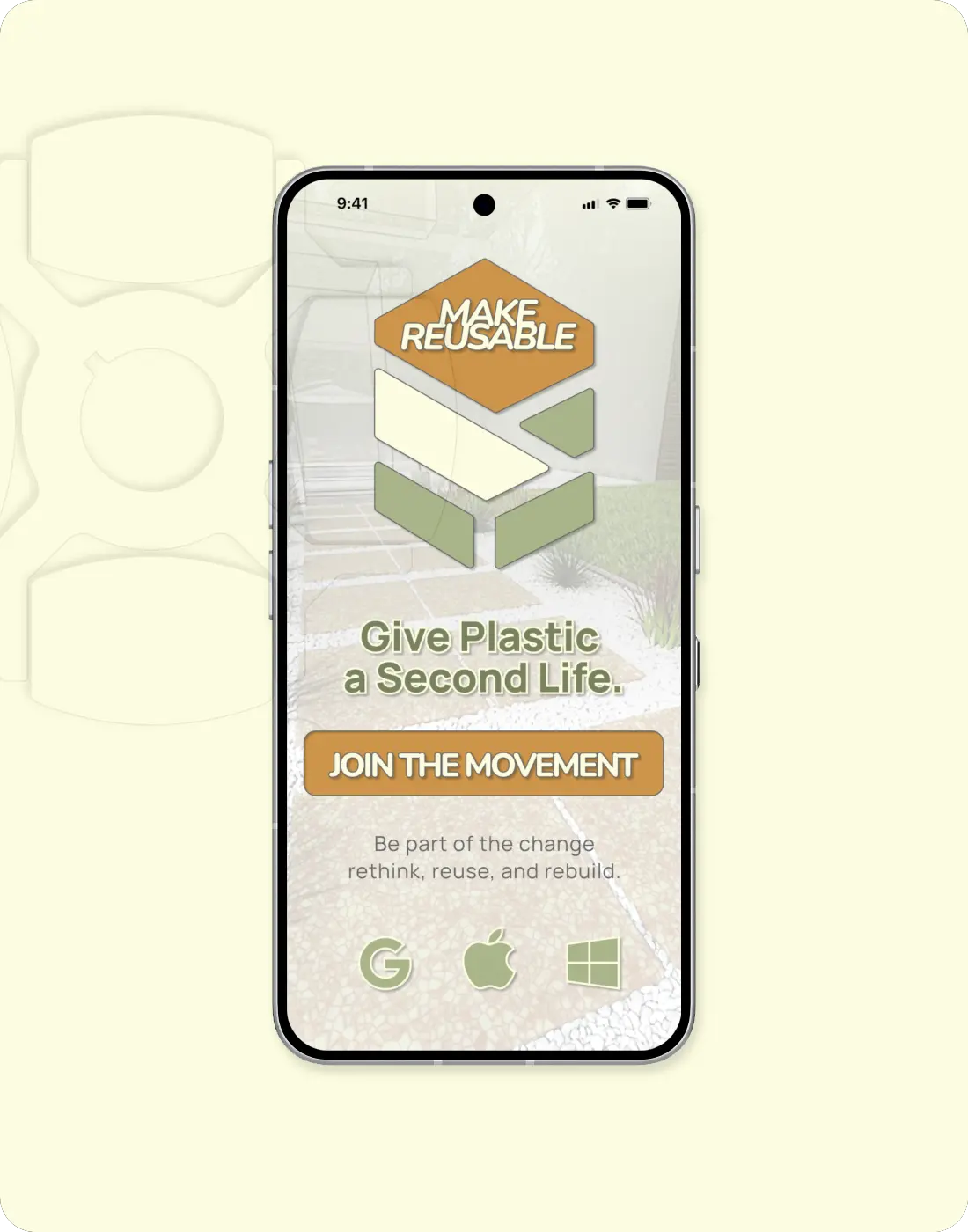 This screen introduces MakeReusable’s core mission: encouraging individuals to rethink plastic waste through reuse and creative transformation. The hero layout was designed to feel bold yet approachable, with clean typography and simple calls to action. The background texture nods to recycled materials, reinforcing the app’s focus on hands-on sustainability. This early concept helped define the visual tone of the platform, one that’s hopeful, solution-oriented, and easy to engage with at any level.