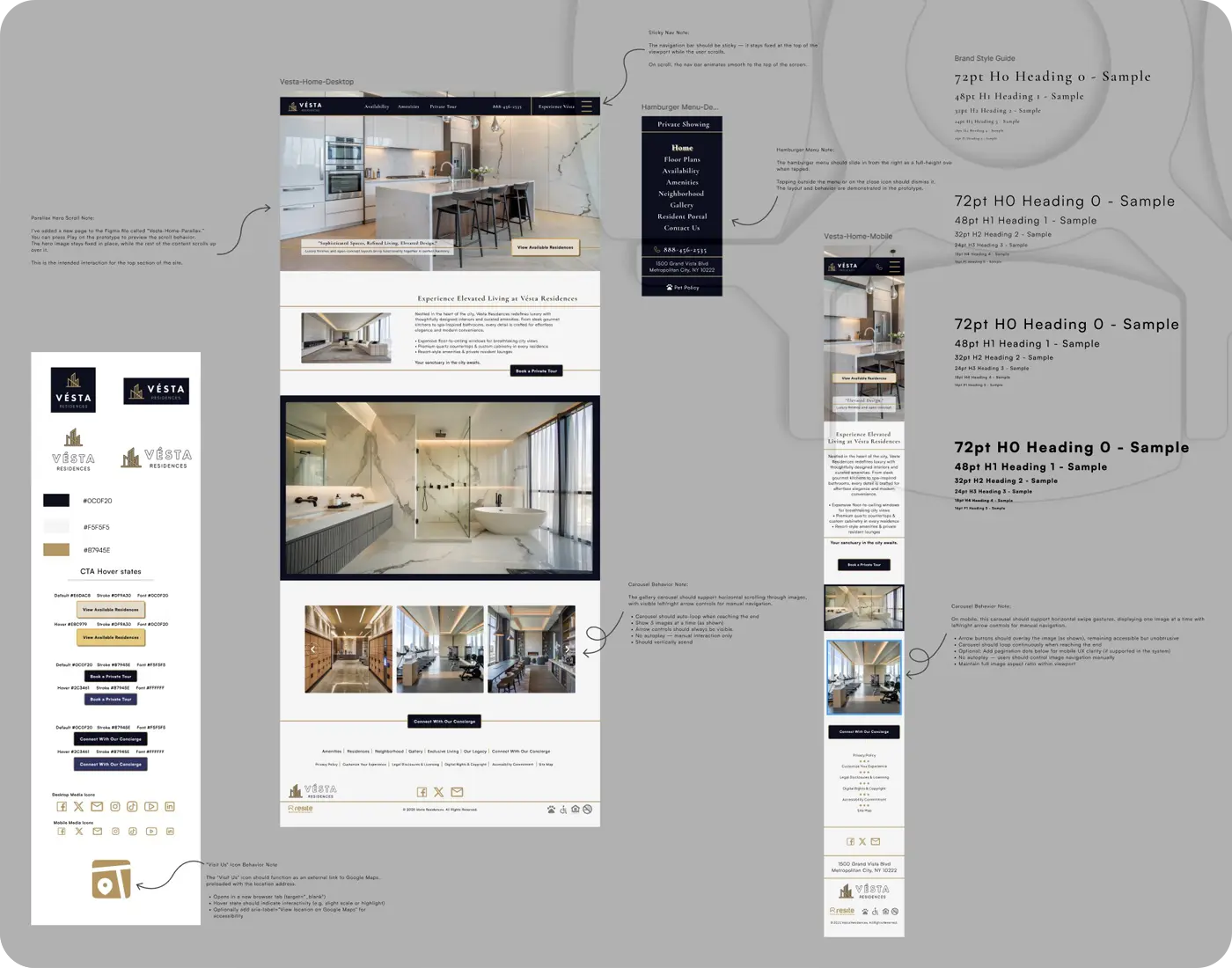 Vésta is a luxury apartment brand that needed a clean, modern marketing website to showcase its residential offerings. I designed a full desktop and mobile experience, including a brand style guide with typography, color palette, button states, and logo treatments. The design emphasizes elegance and clarity, with refined use of whitespace, a simple color system, and thoughtful hierarchy. This image highlights the responsive homepage layout, along with annotations detailing interaction behavior, layout decisions, and branding components. The project was built to scale, allowing for expansion into additional property pages and marketing collateral.