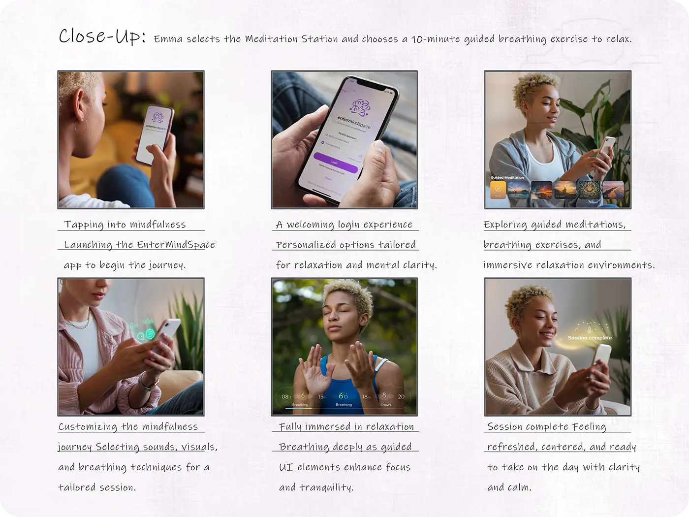 This storyboard illustrates a full user experience inside EnterMindSpace, following Emma as she launches the app and completes a 10-minute guided session. The flow highlights a mindful progression: from login and customization, through immersive meditation, to post-session clarity. Each screen is grounded in real user needs, simplicity, personalization, and emotional support. This storyboard helped communicate the app’s value in a human-centered, relatable way, turning abstract features into a calming narrative users can see themselves in.