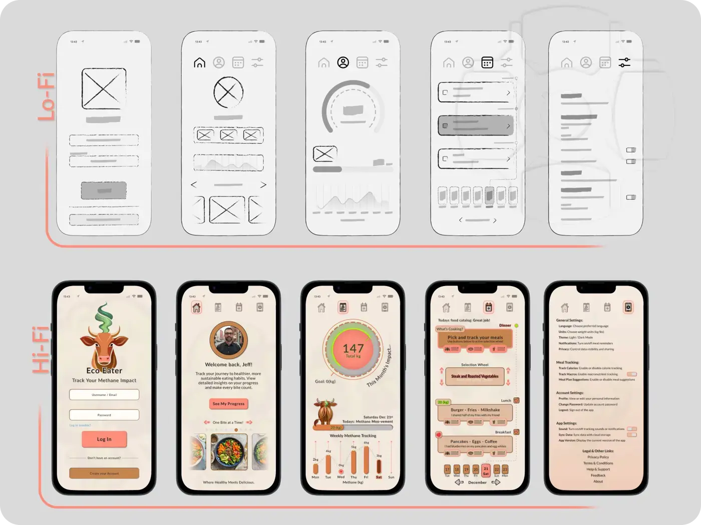 Click to view the Case StudyA methane-tracking mobile app promoting mindful food choices through warm, accessible design.