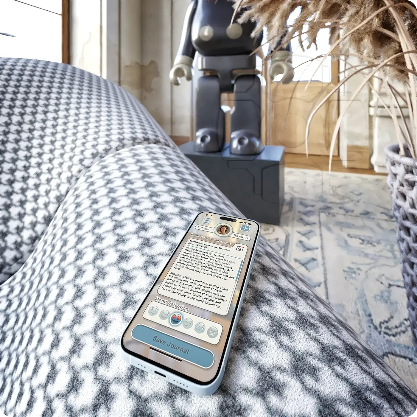 A clean, intuitive journaling interface designed for mental clarity and emotional tracking. The screen featured here is part of EnterMindSpace, a self-reflection app that helps users check in, record thoughts, and identify patterns over time. The render blends interface and environment to present the app in a warm, real-world setting.