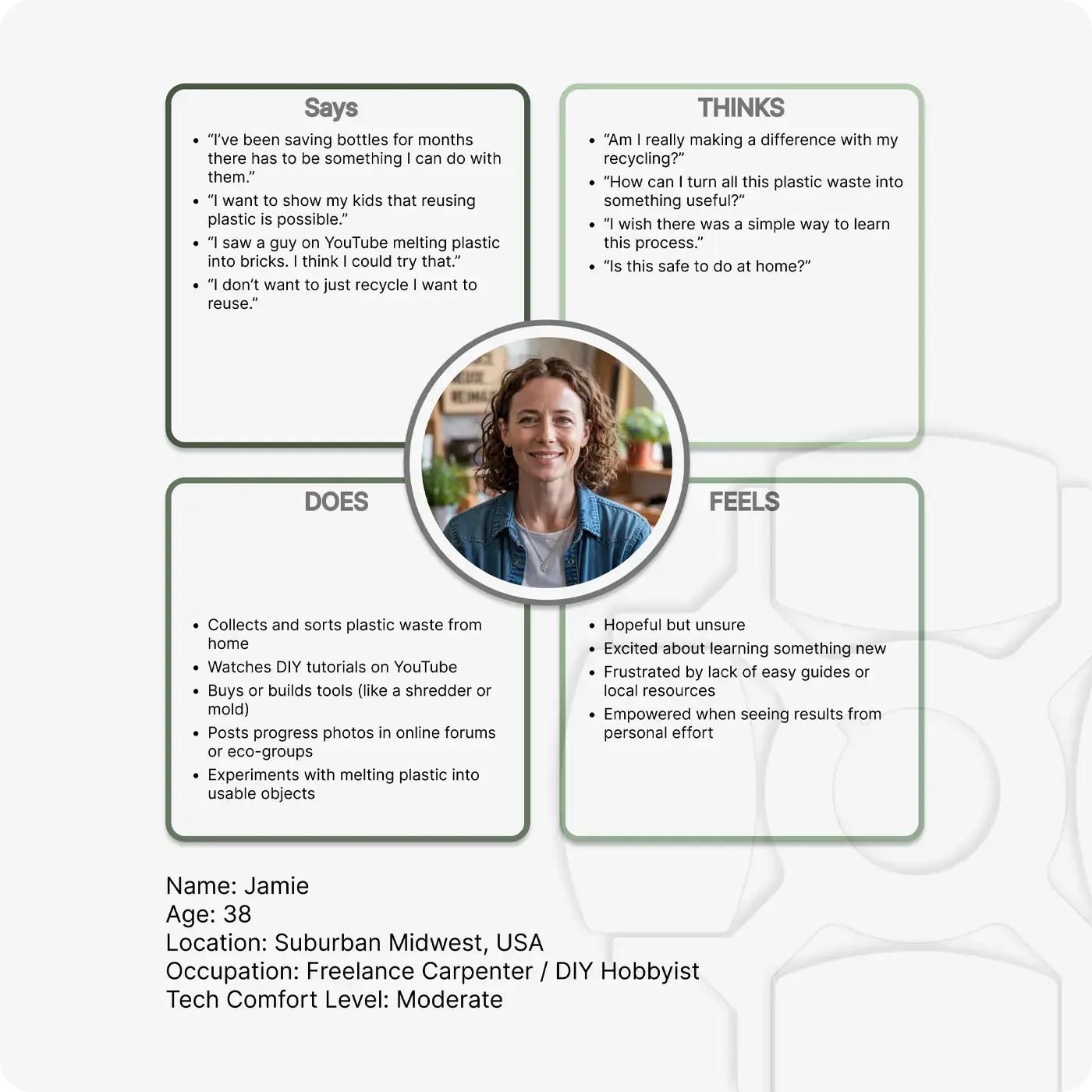 This empathy map was created for MakeReusable, a platform focused on empowering individuals to repurpose single-use plastics through DIY methods. Jamie represents a hands-on, eco-conscious user motivated by both sustainability and curiosity. Her mindset shaped key features of the app, such as simple tutorials, progress tracking, and community support. Understanding Jamie’s emotions, behaviors, and frustrations helped ensure the platform provides clear value without overwhelming users new to plastic reformation.